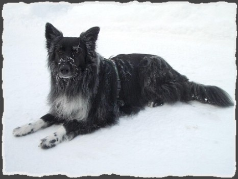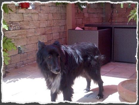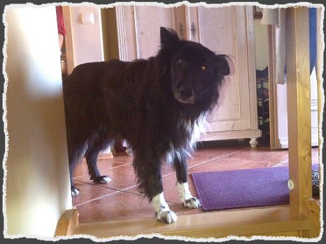 Unsere damals 11-jährige Tochter hat Lord vor etwa einem Jahr so beschrieben: "Lord ist super! Lord ist ein Hund, nein Lord ist der beste Hund der ganzen Welt. Er ist ganz schwarz, bis auf die Schwanzspitze, seinen Hals und seine beiden Vorderpfoten, diese Fellpartien sind nämlich weiß. Er besitzt wunderschöne orange-bronzefarbene Augen und sie sind die ehrlichsten Augen der ganzen Welt. Er hat wunderbare spitze Ohren. Seine edle Schnauze ist glänzend und ganz schwarz. Er ist wunderschön."