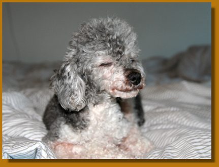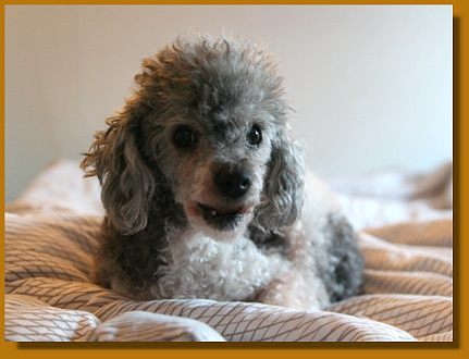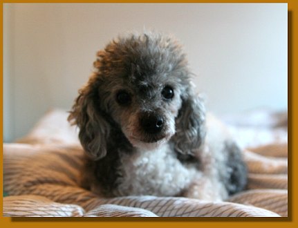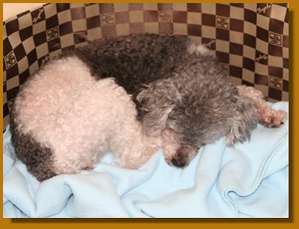ganz liebe Grüße aus dem Süden! Lena ist ja nun schon eine gute Woche hier bei uns und ist einfach nur ein Schatz! Bei der Heimfahrt von München hat sich gleich auf meinem Arm in der Decke eingerollt und fast die ganze Rückfahrt über geschlafen, nur kurz war sie wach, da hätte sie (hätte sie gedurft) neugierig das Auto erkundet. Daheim angekommen, haben sich die drei Pudels beschnuppert und für gut befunden, und sich anschließend alle drei mit Toby auf dem Sofa bequem gemacht - Toffee rechts von ihm, Judy links von ihm und Lena schnarchend auf seinen Beinen.