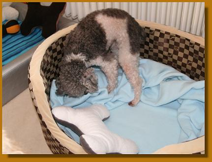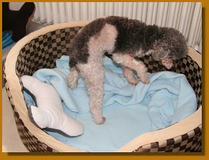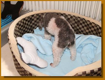 Die Maus ist einfach süß - und fordert auch ihre Streicheleinheiten nachdrücklich ein, wenn sie neben einem auf dem Sofa sitzt, da wird das Näschen dann unter den Arm geschoben und kräftig nach oben gestuppst. Auch ansonsten hat sie sich gut eingelebt: mehrmals täglich wird sich ausgiebig grunzend im Körbchen gewälzt. Danach stellt sie sich dann vor uns und schaut uns schwanzwedelnd ganz groß an - und es sieht fast so aus, als ob sie grinsen würde.