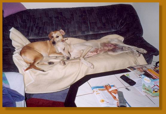 In meinem neuen Zuhause angekommen, haben mein Frauchen und Herrchen dann festgestellt, dass ich doch mehr einer Vogelscheuche als einem edlen spanischen Windhund ähnele. Völlig abgemagert, kein Fell auf meiner Rute, die Zähne grau/schwarz vom Zahnstein.... und überhaupt ....